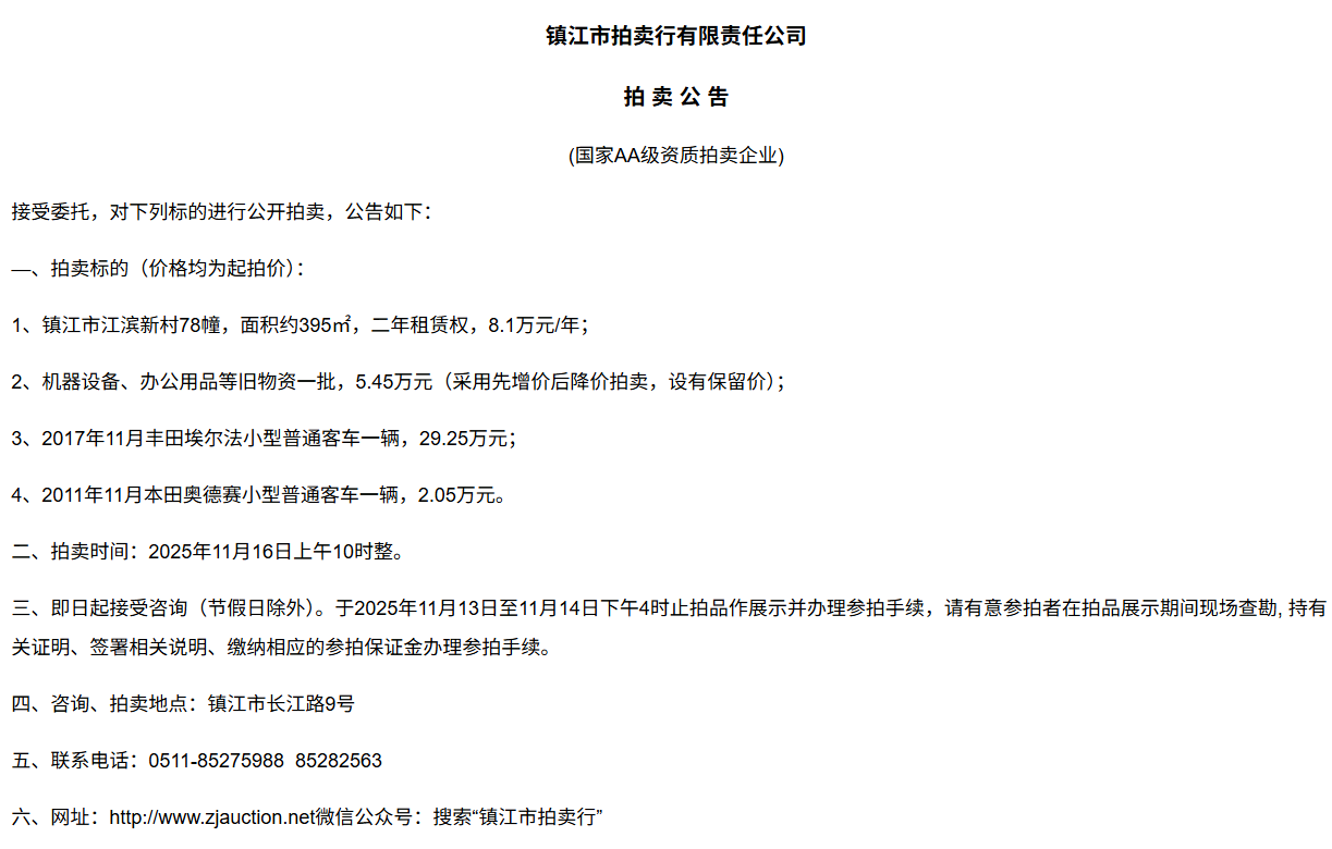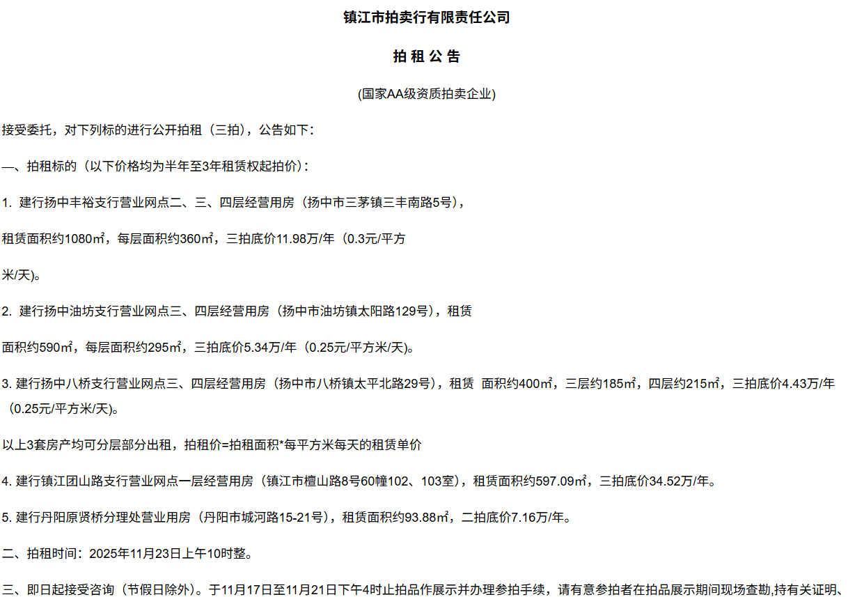 鎮江市拍賣行有限責任公司拍 租 公 吿(國家AA級資質拍賣企業)接受委托,對下列標的進行公開拍租(三拍),公告如下:—、拍租標的(以下價格均為半年至3年租賃權起拍價):1.  建行揚中豐裕支行營業網點二、三、四層經營用房(揚中市三茅鎮三豐南路5號),租賃面積約1080㎡,每層面積約360㎡,三拍底價11.98萬/年(0.3元/平方米/天)。2.  建行揚中油坊支行營業網點三、四層經營用房(揚中市油坊鎮太陽路129號),租賃面積約590㎡,每層面積約295㎡,三拍底價5.34萬/年(0.25元/平方米/天)。3. 建行揚中八橋支行營業網點三、四層經營用房(揚中市八橋鎮太平北路29號),租賃  面積約400㎡,三層約185㎡,四層約215㎡,三拍底價4.43萬/年(0.25元/平方米/天)。以上3套房產均可分層部分出租,拍租價=拍租面積*每平方米每天的租賃單價4. 建行鎮江團山路支行營業網點一層經營用房(鎮江市檀山路8號60幢102、103室),租賃面積約597.09㎡,三拍底價34.52萬/年。5. 建行丹陽原賢橋分理處營業用房(丹陽市城河路15-21號),租賃面積約93.88㎡,二拍底價7.16萬/年。二、拍租時間:2025年11月23日上午10時整。三、即日起接受咨詢(節假日除外)。于11月17日至11月21日下午4時止拍品作展示并辦理參拍手續,請有意參拍者在拍品展示期間現場查勘,持有關證明、簽署相關說明、繳納相應的參拍保證金辦理參拍手續。四、咨詢、拍租地點:鎮江市長江路9號五、聯系方式:0511-85275988   13655299933楊先生六、網址:http://www_zjauction_net.mugsymedia.com;微信公眾號:搜索“鎮江市拍賣行” 拍品清單2025.11.23序號名稱起拍價(元)標的說明1建行揚中豐裕支行營業網點二、三、四層經營用房(揚中市三茅鎮三豐南路5號),租賃面積約1080㎡,每層面積約360㎡三拍底價11.98萬/年(0.3元/平方米/天)1、1-3號房產均可分層部分出租,拍租價=拍租面積*每平方米每天的租賃單價;2、意向競拍人在拍賣前需持營業執照或身份證與委托方說明租賃房產經營業態,確定意向后出具房產承租用途承諾書,經委托方審核后,方可交納保證金參加競拍;3、租賃期限為半年至3年(承租方與出租方協商而定),承租方每半年或一年結付租金,租賃期間的水、電費用及其它相關費用均由承租方承擔;4、承租方不得用于經營和保管危險物品,不得用于開設餐飲、娛樂等可能嚴重影響消防安全、運營安全的經營業態,不得用于經營委托貸款、小額貸款等可能冒用委托方名義,帶來聲譽風險的經營業態。租賃期內,承租方不得破壞墻體結構,自行成就消防、安全等使用條件,不得擅自將租賃房屋轉租、轉讓給他人使用,否則委托方有權收回房屋;5、拍租成交后,承租方將租金交至出租方指定賬戶,傭金交至拍賣方賬戶(拍租傭金為該房屋一個月租金)。承租方憑租賃合同無息退還保證金。2建行揚中油坊支行營業網點三、四層經營用房(揚中市油坊鎮太陽路129號),租賃面積約590㎡,每層面積約295㎡三拍底價5.34萬/年(0.25元/平方米/天)3建行揚中八橋支行營業網點三、四層經營用房(揚中市八橋鎮太平北路29號),租賃面積約490㎡,每層面積約245㎡三拍底價4.43萬/年(0.25元/平方米/天)4建行鎮江團山路支行營業網點一層經營用房(鎮江市檀山路8號60幢102、103室),建筑面積約597.09㎡三拍底價34.52萬/年5建行丹陽原賢橋分理處營業用房(丹陽市城河路15-21號),建筑面積約93.88㎡二拍底價7.16萬/年